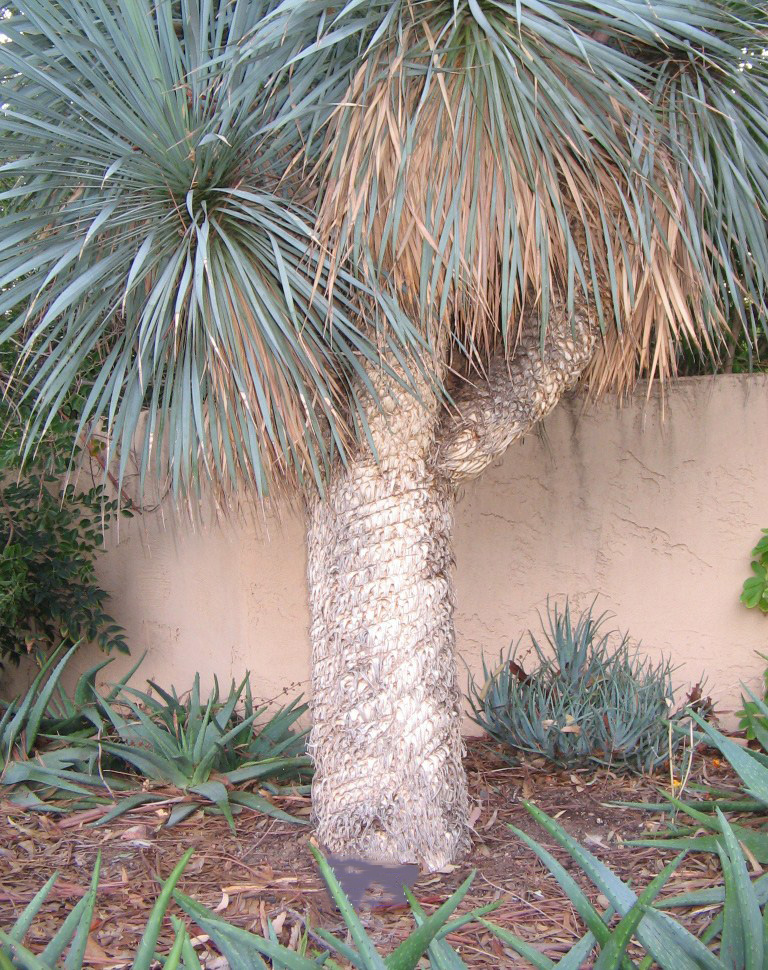 W naturze pień pokryty jest zwisającymi suchymi liśćmi, które pozostawione na pniu nadają mu charakterystyczny rustykalny wygląd. Po przekwitnięciu pień może rozgałęziać się.